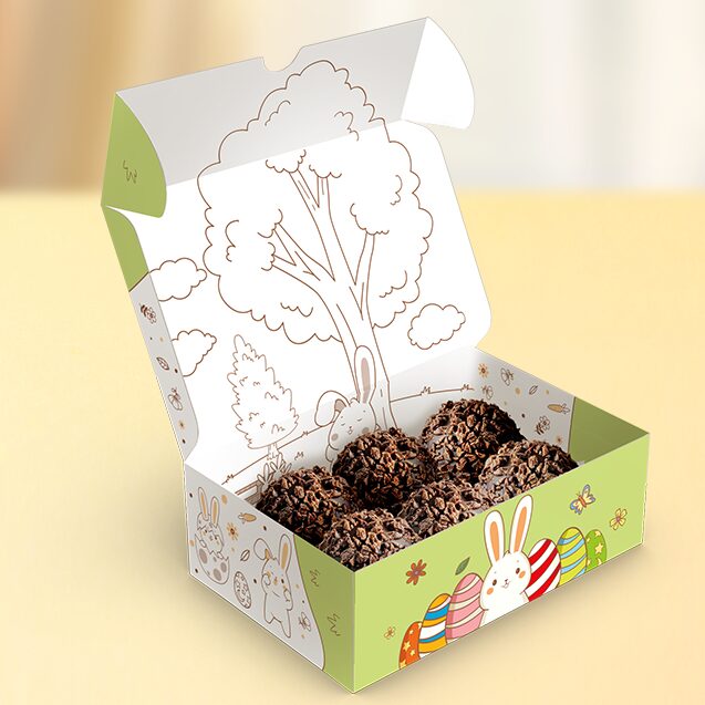 A Caixa 6 Doces Practice da linha Páscoa Colorir é criativa e funcional. Com design ilustrado para pintar, incentiva a personalização e o toque artesanal.