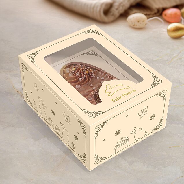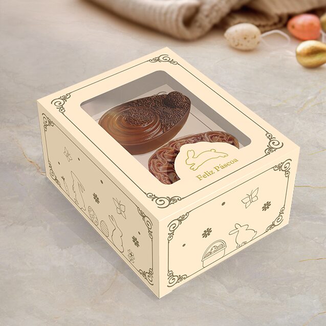 Com acabamento em hot stamping ouro e visor transparente, acomoda ovos de colher ou mini doces com sofisticação.