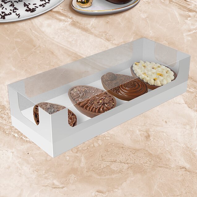 Produzida em papel cartão branco, possui espaço interno para quatro mini ovos de até 50g, ideal para combinações personalizadas.
