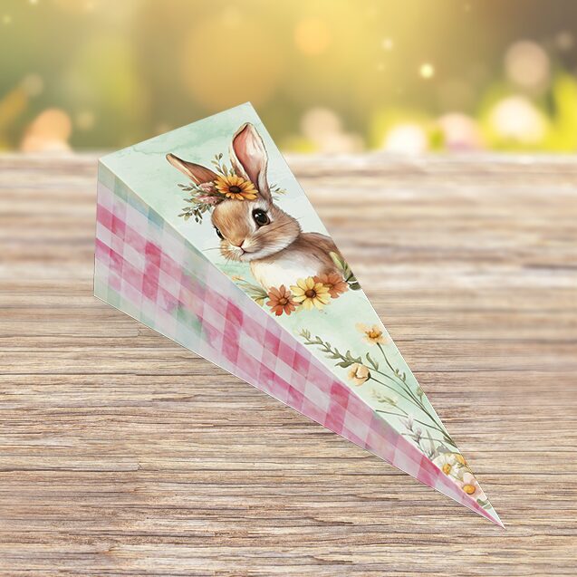 O Cone da linha Páscoa Encantos é uma embalagem moderna e versátil, ideal para doces e lembranças criativas.