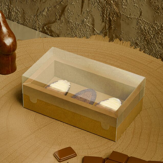 Produzida em papel kraft resistente, conta com moldura frontal e espaço interno para três mini ovos de até 50g.