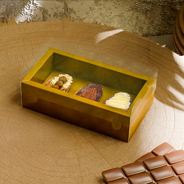 Produzida em papel cartão hot stamping ouro de alta qualidade, possui espaço interno para três mini ovos de até 50g, unindo praticidade e elegância.